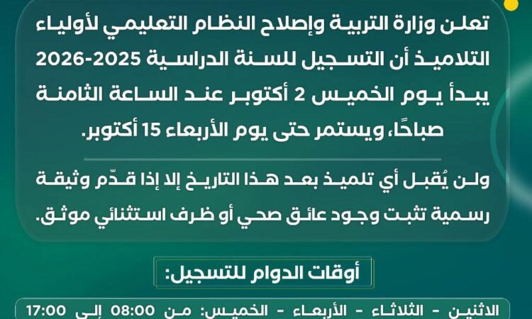 أعلنت وزارة التربية وإصلاح النظام التعليمي فتح باب التسجيل للعام الدراسي 2025-2026 ابتداءً من يوم الخميس 2 أكتوبر عند الساعة الثامنة صباحًا، على أن يستمر حتى يوم الأربعاء 15 أكتوبر المقبل