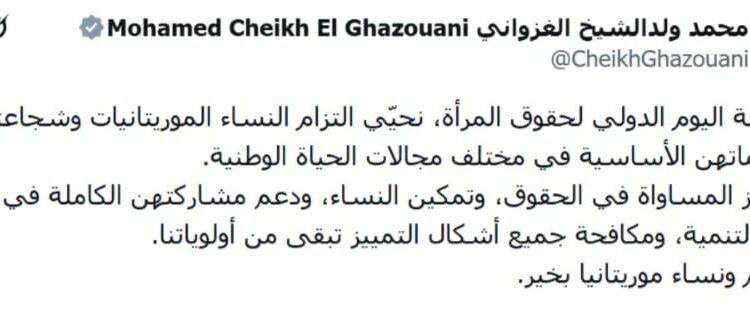 ونوه ولد الغزواني في تغريدة على حسابه في موقع “أكس” بإسهامات النساء الموريتانيات الأساسية في مختلف مجالات الحياة الوطنية.